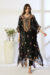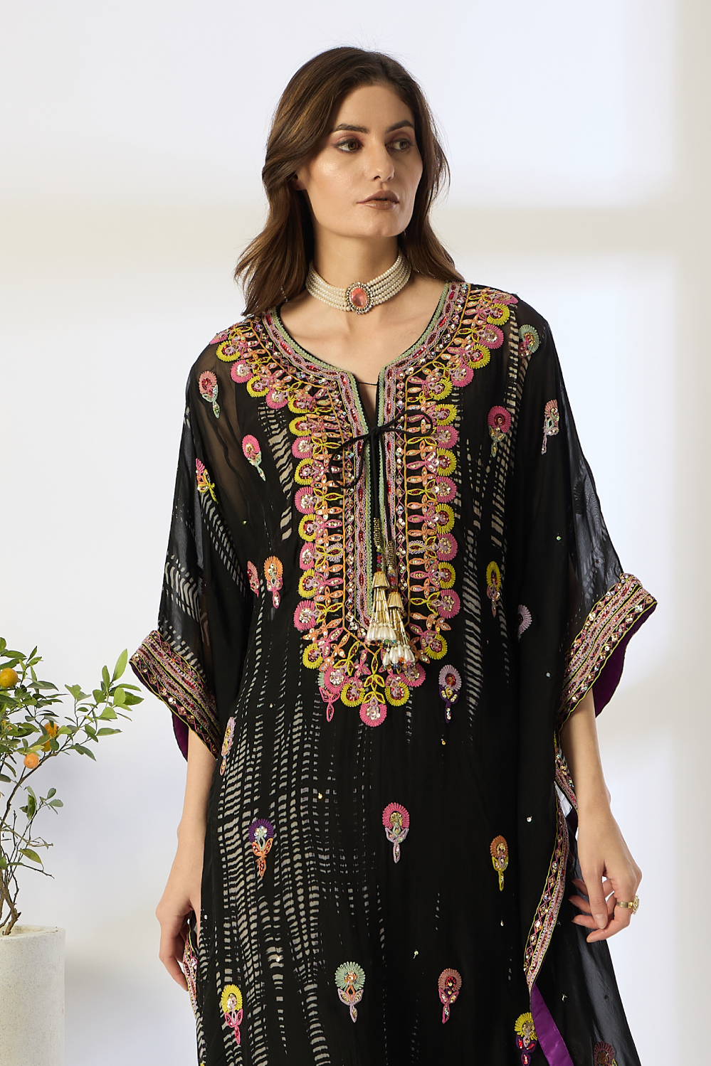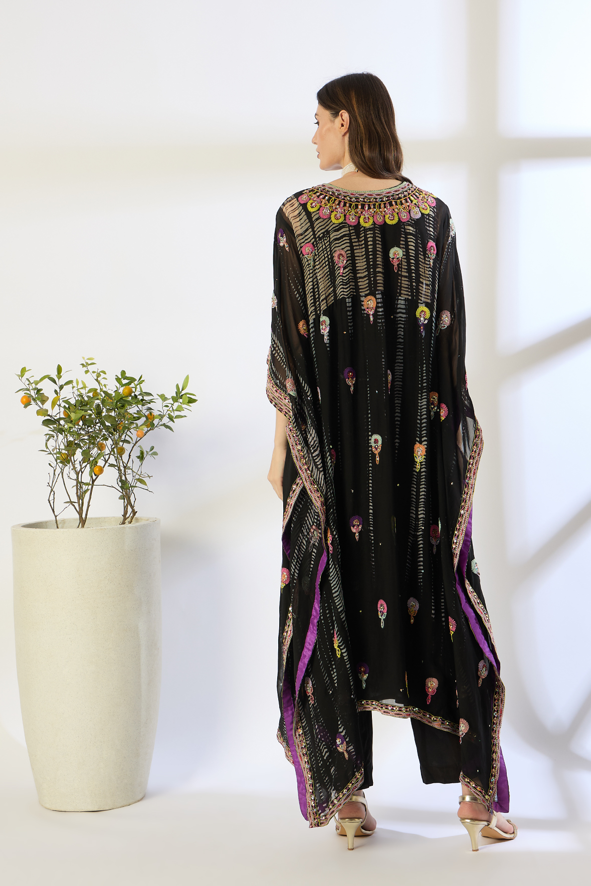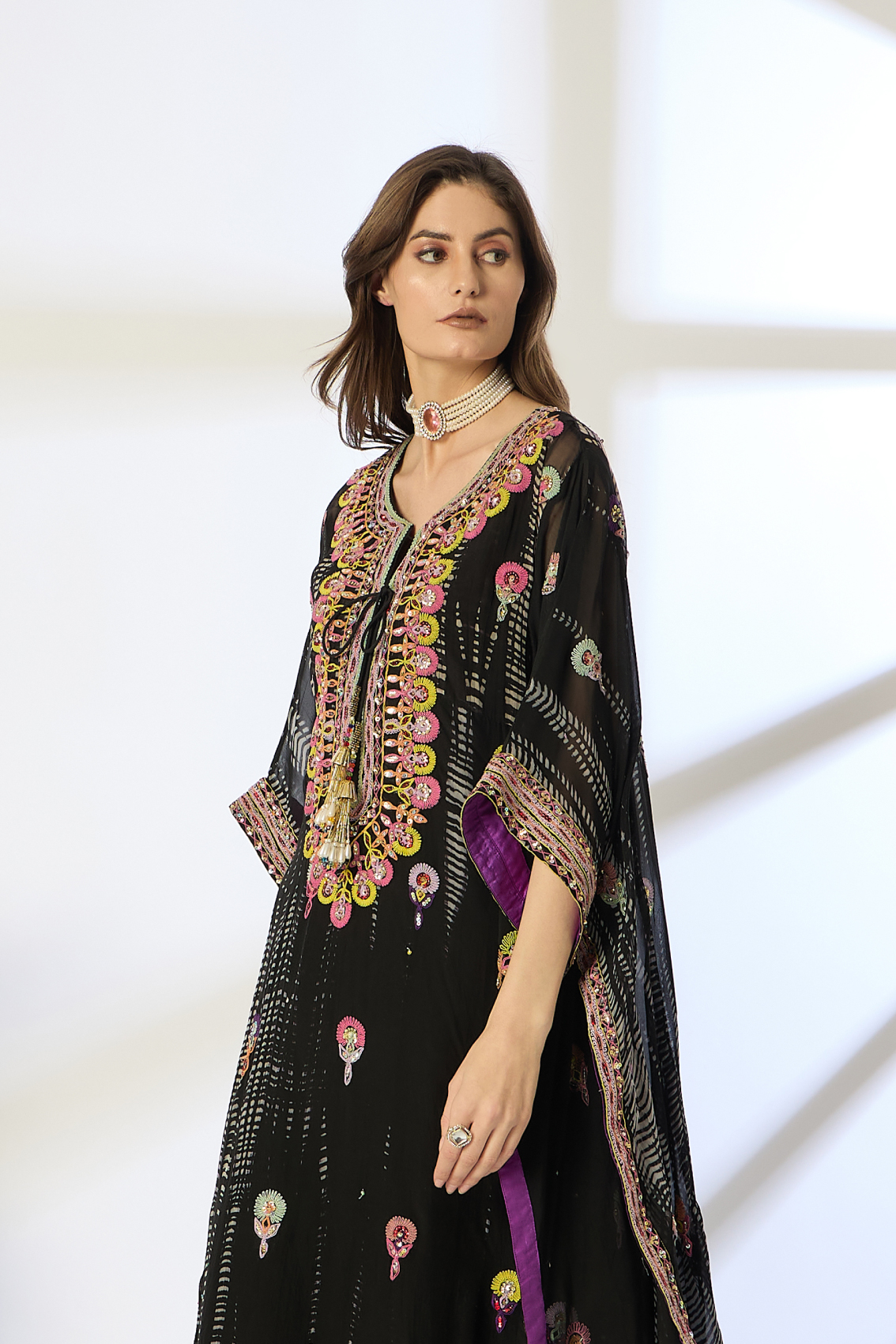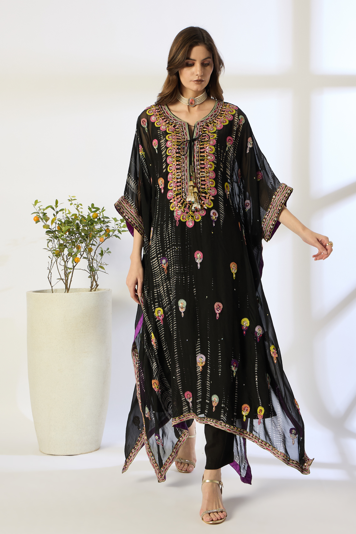 A black organza kaftan adorned with multicolour embroidery, paired with matching pants and a slip. The sheer organza fabric offers a graceful, airy drape, while the vibrant embroidery adds a bold, eye-catching contrast. Completed with a slip for coverage and tailored pants for structure, this ensemble blends elegance with contemporary flair—ideal for festive or evening wear.