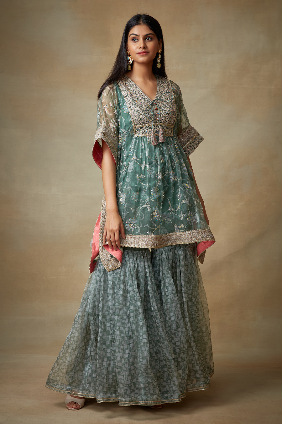 Printed organza kaftan with garara with ahri work, with crepe inner. Gota and sequin work on neck.