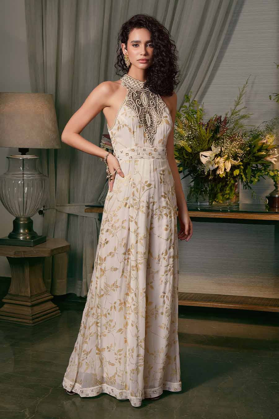 Introducing our Ivory Jumpsuit—a stunning blend of sophistication and style. This georgette jumpsuit, elegantly lined with crepe, radiates timeless charm and comfort. The pearls and sequin work on the jumpsuit add a touch of opulence and glamour.